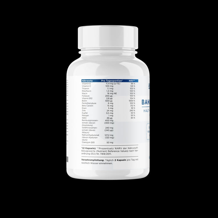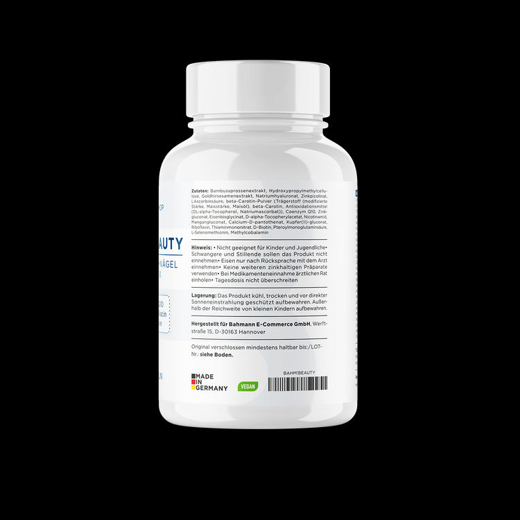 Zink und Selen stärken speziell deine Nägel, während Kupfer und Bambusextrakt dein Haarwachstum und die Pigmentierung unterstützen. Ergänzt wird die Rezeptur durch Vitamin E, Q10 und Carotinoide, die deine Haut vor oxidativem Stress schützen und jugendliche Frische bewahren.