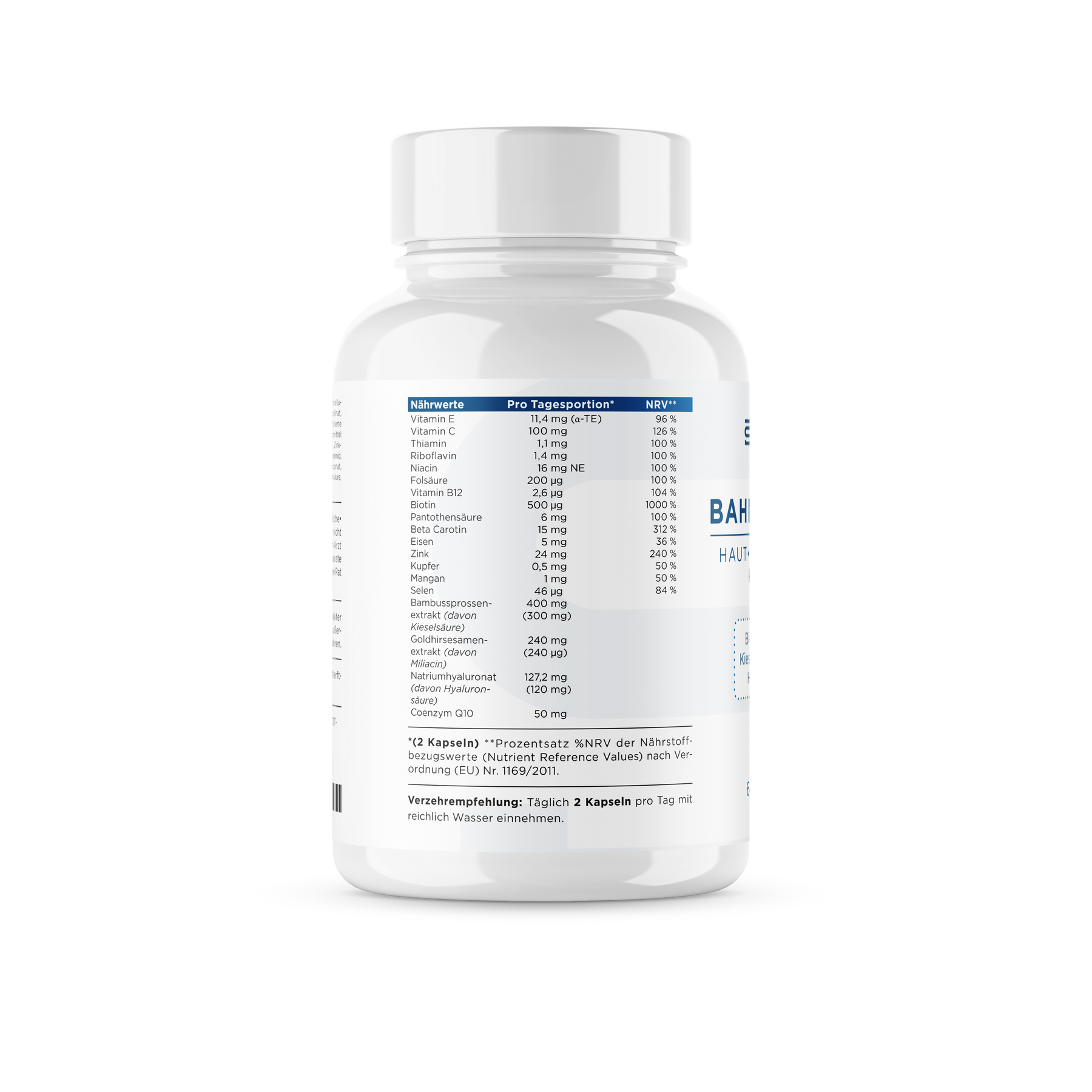 Bambussprossenextrakt, Hydroxypropylmethylcellulose, Goldhirse­samenextrakt, Natriumhyaluronat, Zinkpicolinat, L-Ascorbinsäure, Beta-Carotin-Pulver (Trägerstoff [modifizierte Stärke, Maisstärke, Maisöl], Beta-Carotin), Antioxidationsmittel (DL-alpha-Tocopherol, Natriumascorbat), Coenzym Q10, Zinkbisglycinat, Eisenglycinat, DL-alpha-Tocopherylacetat, Nicotinamid, Mangan­gluconat, Calcium-D-pantothenat, Kupfer(II)-gluconat, Riboflavin, Thiaminmononitrat, D-Biotin, Pteroylmonoglutaminsäure, L-Selenomethionin, Methylcobalamin.