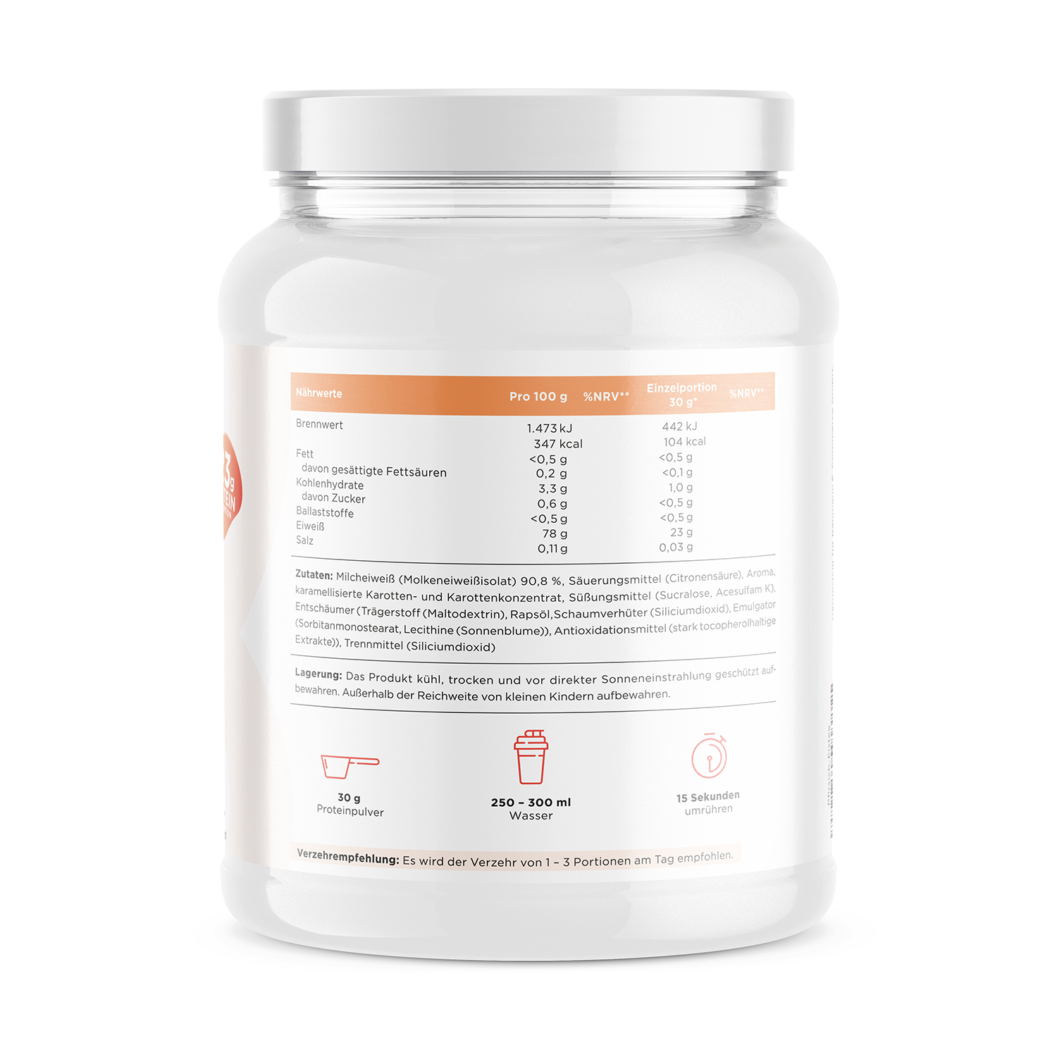 Zutaten Pfirsich-Eistee: Milcheiweiß (Molkeneiweißisolat) 90,8 %, Säuerungsmittel (Citronensäure), Aroma, karamellisierte Karotten- und Karottenkonzentrat, Süßungsmittel (Sucralose, Acesulfam K), Entschäumer (Trägerstoff (Maltodextrin), Rapsöl, Schaumverhüter (Siliciumdioxid)), Emulgator (Sorbitanmonostearat, Lecithine (Sonnenblume)), Antioxidationsmittel (stark tocopherolhaltige Extrakte), Trennmittel (Siliciumdioxid).