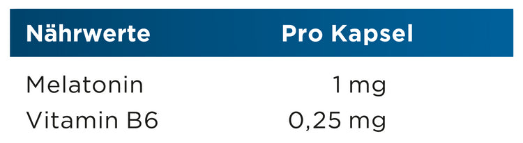 Zutaten: Süßungsmittel Mannitol, Füllstoff mikrokristalline Cellulose, Aroma, Säuerungsmittel Citronensäure, Trennmittel (Magnesiumstearat, Siliciumdioxid), Melatonin, Pyridoxinhydrochlorid
