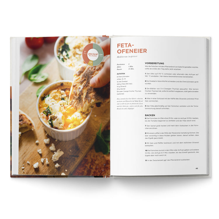 ✅ Volle Kontrolle, kein Kalorien-Chaos Jedes Rezept enthält ein einfaches Nährwert-Diagramm mit detaillierten Kalorien- und Makroangaben auf einen Blick. So siehst du sofort, was auf deinem Teller landet – null Stress.