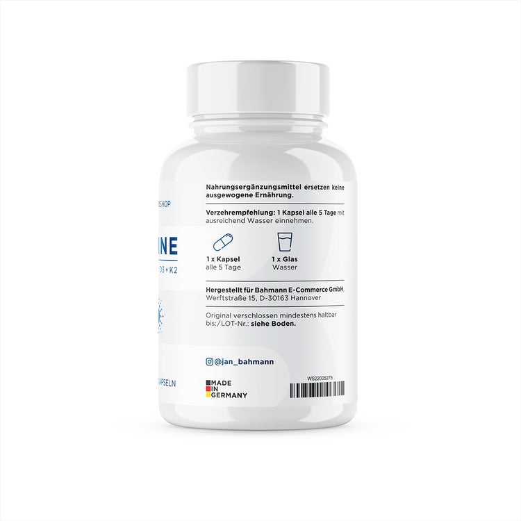 Zutaten: Pflanzenöl (Kokos), Hydroxypropylmethylcellulose (Kapselhülle), Cholecalciferol, Menachinon-7